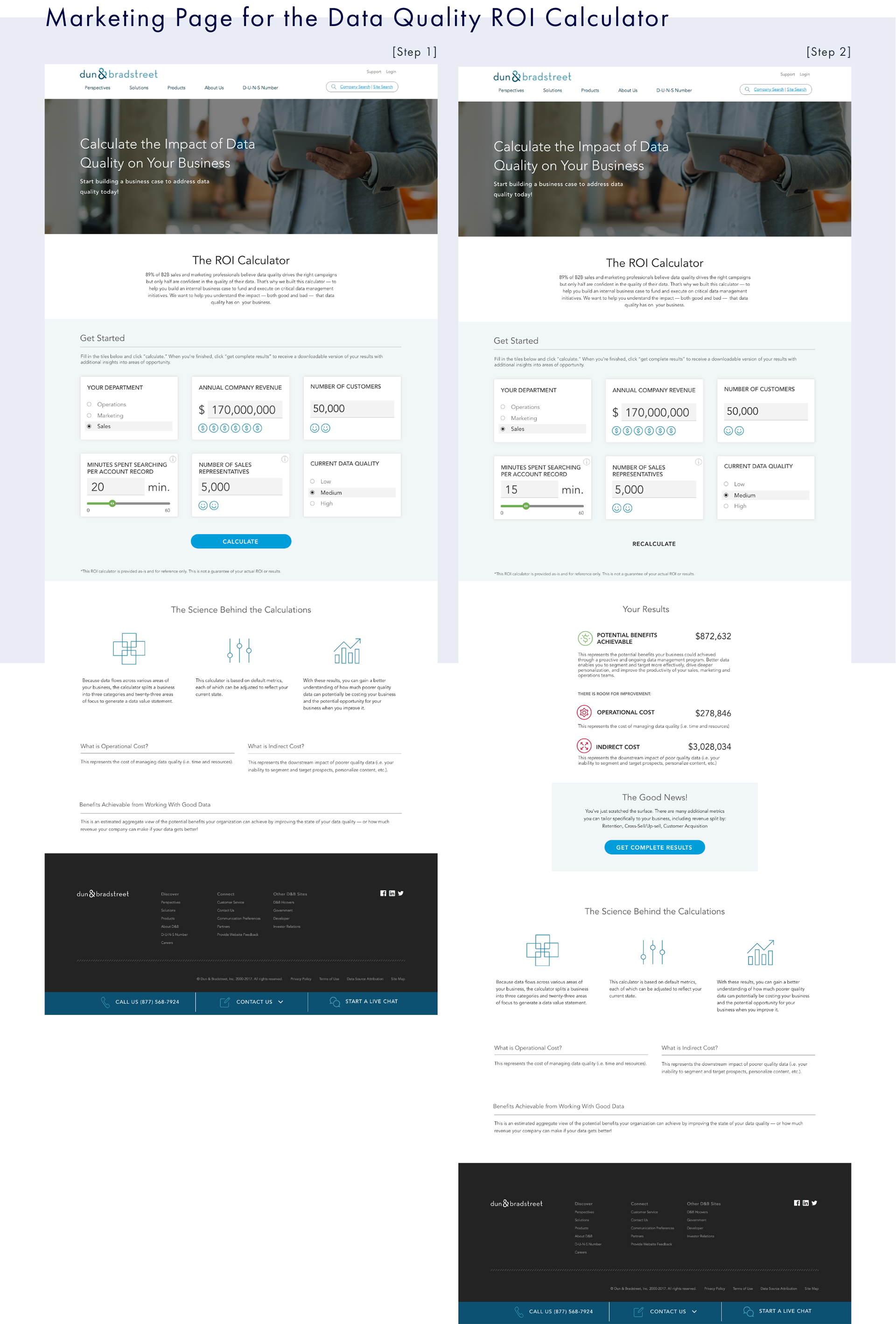 The Data Value ROI Calculator is an interactive tool to help prospects and customers understand the value that good data quality has on their business and the impact poor data quality is having. I worked cross collaboratively with Product, developers, Sales, and Marketing key stakeholders to design 2 experiences, a marketing tool that teases the high level inputs and a pre sales tool used by a sales rep. This was a fast paced, high priority, project commissioned by the GM of the business.